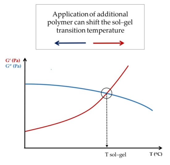 The determination of the sol–gel transition temperature can easily be performed using dynamic oscillatory experiments. The measurement of the viscous and elastic modulus as a function of temperature clearly and unambiguously assigns the rheological changes associated with the sol–gel transition. The intersection or cross-over point of the moduli (G″ = G′) determines the changes that have occurred in the gel structure and clearly indicates the transition temperature [18,19]. Among the issues of the temperature dependence of mechanical properties, it is worth noting that thermally responsive polymers such as poly(N-isopropylacrylamide) (PNIPAm) or polyvinyl alcohol-based poly(N-isopropylacrylamide) (PVA-PNIPAm) composites undergo a sharp volumetric phase transition around their lower critical solution temperature (LCST), which also affects their viscosity and elastic modulus [20,21,22].
