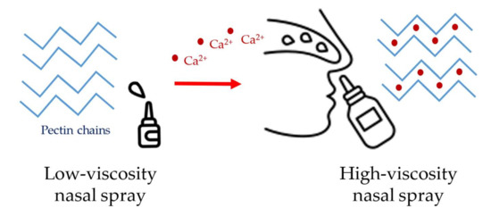 The ability of pectin to develop Ca2+ ion bridges makes it a favorable pharmaceutical carrier in nasal preparations. As calcium ions are present in abundance in the nasal fluid, the gelation of pectin occurs after the application. Due to the presence of calcium ions, the viscosity of the preparation increases. The ionic cross-linking of pectin in nasal spray provides an extended residence time for the formulation. PecFent® is a marketed product that contains fentanyl for the relief of breakthrough pain (Figure 12). The sustained drug release is due to the pectin content, which means that gelation occurs upon contact with the nasal mucus [96,97].