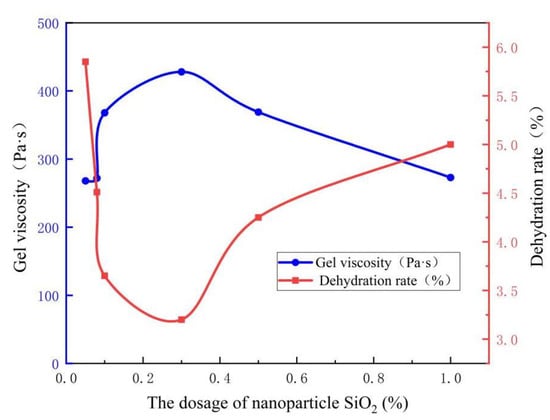 As shown in Figure 2, within a certain concentration range, the gelling strength of the system gradually increases with the increase of the dosage of nanoparticle SiO2. When the dosage of nanoparticle SiO2 reaches 0.3%, the gel viscosity is up to 42.8 mPa·s, and the dehydration rate for 10 days is only 3.2%. If the dosage of nanoparticle SiO2 continues to increase, the gelling strength of the system shows a downward trend, So 0.3% is the optimal dosage of nanoparticles.