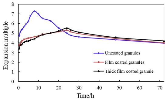According to Figure 8, the initial expansion of the granule is rapid, reaching the maximum expansion multiplier within 8 h. In contrast, the thin and thick film of the granule begins to slowly decompose at high temperatures, and the granule slowly expands, reaching the maximum expansion multiplier of 5.31 within about 24 h, with good slow expansion performance. After the granules reached the maximum expansion multiplier, the granule began to shrink slowly and finally stabilized gradually, the expansion multiplier of 72 h stabilized at about 4 times.