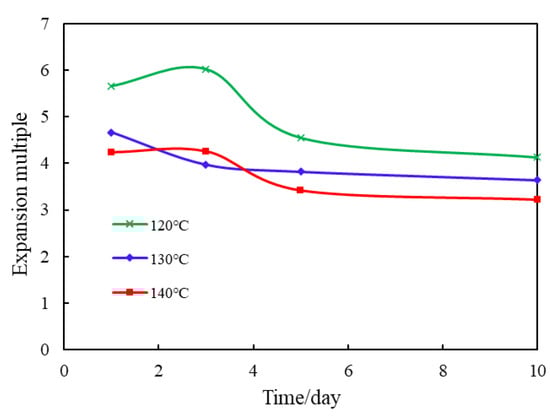 There is a test to the effect of temperature on the expansion multiplier of overcoated granules, Tahe Oilfield is a high-temperature reservoir, so three higher temperature gradients, 120 °C, 130 °C, and 140 °C, are set. By comparing the expansion performance of overcoated type expansion granules in 1–10 days, the experimental results are shown in Figure 9.