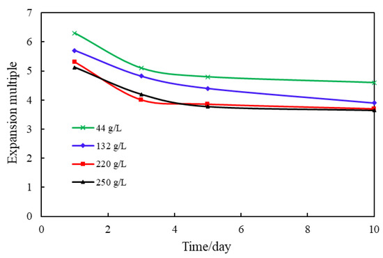 The mineralization of the simulated formation water in Tahe River was 220 g/L. The simulated formation water was diluted with distilled water by 20% and 60%, and the water samples with mineralization of 44 g/L and 132 g/L were prepared, respectively. 3% NaCl was added to the simulated formation water and water samples with mineralization of 250 g/L were prepared to investigate the changes in granule swelling times under different mineralization. The evaluation time was 10 days and the experimental results are shown in Figure 10.
