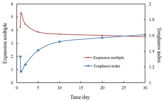 To summarize and compare the experimental results of the expansion multiplier and toughness index measured by aging the granules under high temperature and high salt for 2 h–30 days, as shown in Figure 11.