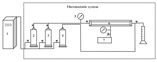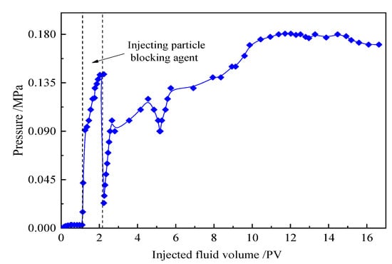 The core flow experiments were conducted to evaluate the water-blocking ability of the granules in the reservoir. In the experiment, the saturated oil was dehydrated, and degassed crude oil from Tahe Oilfield (with a viscosity of 55.1 mPa·s), and the injected water was simulated with Tahe formation water at an injection rate of 0.5 mL/min, as shown in Figure 12.