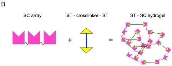 In addition, we speculate that lengthening the SC array lowers the ST–SC threshold needed to form a hydrogel, in terms of both the ST:SC ratio and protein concentration. This can already be seen in Figure 2, where at the same 1:1 concentration, ST–SasG–ST exhibited G′ = 10,000 Pa when combined with SC3, but G′ = 1000 Pa when combined with SC4. The same can also be observed for combinations of ST–SasGlong–ST with SC3 or SC4. Therefore, we predict that further lengthening the SC array by genetically engineering a longer version of the protein could push the formation of a hydrogel at a very low protein concentration. However, we acknowledge that it is not trivial to genetically engineer longer versions of the SC arrays due to their very repetitive sequence. Finally, the G′ of these networks are in good accordance with those of medium viscoelastic organs, such as livers and kidneys, highlighting the suitability of these hydrogels for tissue engineering applications [17].