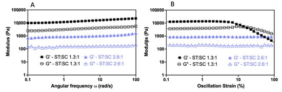 Viscoelastic changes in response to ST–SasG–ST and SC3 ratio variation in frequency (A) and strain sweeps (B). At the ratio of 1.3:1, the network showed G′ = 10,000 Pa and critical yield stress at 10% strain. Meanwhile, the 2.6:1 network showed G′ = 1000 Pa and no yield up to 100% strain. The angular frequency SD values of G′ and G″ are 6.02% and 4.01% for the 1.3:1 ratio, and 9.7% and 7.09% for the 2.6:1 ratio, respectively. The strain SD values of G′ and G″ are 19.2% and 8.09% for the 1.3:1 ratio, and 8.39% and 9.21% for the 2.6:1 ratio, respectively.