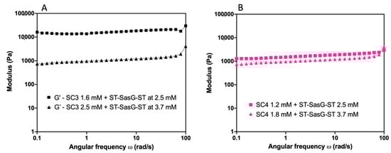 Viscoelastic changes in response to the increase in the total protein concentration. (A) Different SC3 + ST–SasG–ST combinations at 1.6 mM + 2.5 mM (black squares) and 2.5 mM + 3.7 mM (black triangles). SC3 shows G′ = 10,000 Pa at lower protein concentrations and G′ = 1000 Pa at higher protein concentrations. SD values are 3.93% and 4.05%, respectively. (B) Different SC4 + ST–SasG–ST combinations of 1.2 mM + 2.5 mM (pink squares) and 1.8 mM + 3.7 mM (pink triangles). SC4 shows G′ = 1000 Pa in both protein concentrations. SD values are 1.01% and 2.36%, respectively. Protein concentration was increased by 1.5 at each step.