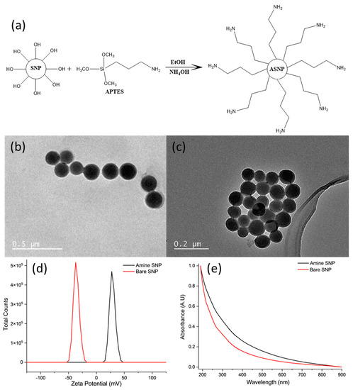 (a) Surface functionalization of silica nanoparticles (SNPs) by APTES to produce amine functionalised silica nanoparticles (ASNPs); (b) TEM image of bare silica nanoparticles (SNPs); and (c) amine silica nanoparticles (ASNPs); (d) Zeta potential of SNPs and ASNPs using 5 mg/mL per sample; and (e) UV-VIS of bare SNPs and ASNPs using 5 mg/mL per sample.