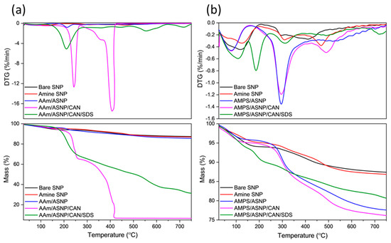 DTG and TGA profiles for (a) AAm and (b) AMPS degassed using GOx with ASNP, ASNP/CAN and ASNP/CAN/SDS, compared to Bare SNPs.