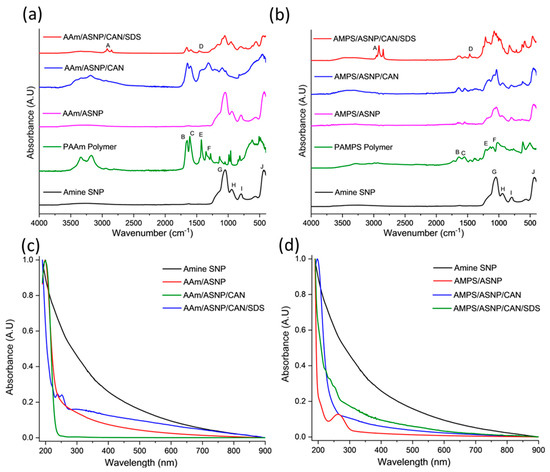 FTIR spectra post graft polymerisation of (a) AAm and (b) AMPS on the surface of amine silica nanoparticles (ASNP) compared to ASNPs, PAAm and PAMPS, degassed using GOx. Band indexing A–J shown in Supplementary Information Tables S1 and S2. UV-Vis of (c) AAm and (d) AMPS in combination with amine functionalised silica nanoparticles (ASNP), ASNP/CAN, and ASNP/CAN/SDS compared to ASNP.
