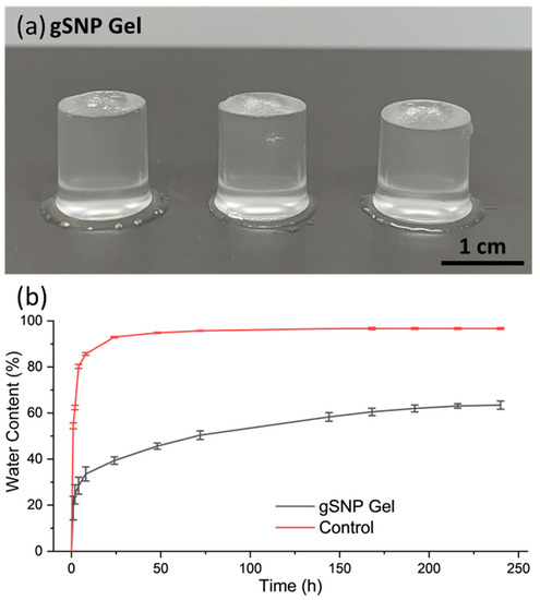 (a) Images of the amine silica nanoparticle hydrogels with PAMPS and PAAm polymer grafts (gSNP Gels). (b) Swelling profile for the amine silica nanoparticle hydrogel with PAMPS and PAAm polymer grafts (gSNP Gels), and Control (gels without ASNPs/GOx).