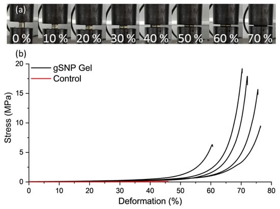 Figure 6 shows the compression curves for gSNP Gels, and Table 2 provides a summary of the results. An average compressive stress of 13.9 ± 5.5 MPa with fracture strain of 69.6 ± 6.4% was achieved for gSNP Gels, two orders of magnitude greater than control gels. The values for these hydrogels are comparable to the compressive strength of articular cartilage, with values ranging between 5 MPa and 20 MPa [57,58]. The compressive strength of nanocomposite hydrogels ranges from ~100 kPa to 70 MPa [12,59,60,61]. However, the results are highly dependent on testing methods and sample size during compression. Nonetheless, the improved compressive strength relative to control gels as well as other nanocomposite gels can be attributed to the covalently bonded polymer grafts on the surface of the ASNPs. The gSNP Gels sustained strains up to 75%, likely due to the internal structure of material. The polymer-ASNP composite structures are likely to interact and cross link with each other, leading to an increase in resistance to stress. This will lead to an increase in the compressive strength and allow the material to resist larger strains, as witnessed in the strain values in Figure 6. Ultimately, the gSNP Gels here show a seven fold improvement in maximum compression strength relative to nanocomposite polymer grafted ANC Gels [19]. The synthesis method used in this work can be used to tailor the mechanical properties of these hydrogels further by varying the concentration of the two polymer-ASNP grafted networks. These gSNP Gels are intended for cyclic applications such as cartilage repair or for bone tissue regeneration.
