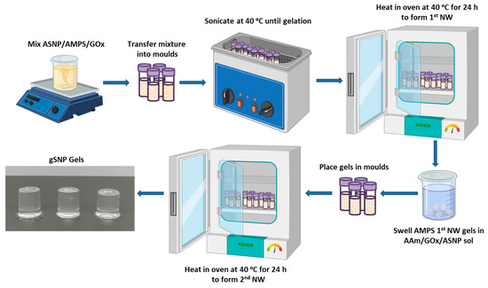 The hydrogels were removed from the moulds and soaked in a monomer solution of 2.54 M AAm containing 150 mg ASNP, 0.1 wt. % MBIS, 0.7 g CAN, and 200 nM GOx/G. Once the hydrogels were swollen, they were placed in moulds and put into a 40 °C oven to form the second network. The final hydrogels are referred to as gSNP gels. The gSNP gels were then dried at 60 °C and, at their dry state, placed in water to swell for a week. Figure 8 shows a schematic representation of the hydrogel synthesis route described above. A comparison control hydrogel was produced using the same concentrations of AMPS (first network) and AAm (second network) along with MBIS as a crosslinker, by means of a sequential FRP process, but without the presence of ASNPs and GOx.