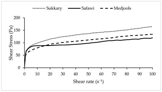 The viscosity results showed that the date-based sports energy gels made from Sukkary had the highest viscosity of 11,417 ± 587 mPa·s, followed by Medjool and Safawi date-based sports energy gels which had values of 10,539 ± 1323 mPa·s and 8371 ± 972 mPa·s, respectively. These results were found to be in coherence with the mechanical properties for each date cultivar. The lower the hardness, chewiness, and gumminess of the dates, the more viscous the gel produced will be. The viscosity of the gels was also affected by the type and concentration of the gelling agent used in the gel production. The viscosities in the present study were found to be higher than in gels studied by Lestari, et al., (2021) [] and are in the range of viscous liquids reported in Rao (1977) [], as the authors used only 0.1% of xanthan gum compared to 0.5% of xanthan gum which was used in this new developed date-based sports energy gel.Based on the flow curve of the date-based sports energy gels presented in Figure 1, it is shown that this newly developed sports energy gel behaves rheologically as a non-Newtonian fluid with shear thinning properties, where its viscosity decreases with increasing shear rate, leading to a perception of it being easy to swallow [] which is a pertinent attribute for sports energy gels.
