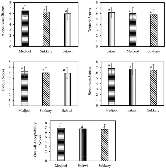 However, the analysis of variance displayed that there are no significant differences in the appearance, texture, odour, sweetness, and overall acceptability values of gels prepared from Sukkary, Medjool, and Safawi. These results could be comparable with those found for date jam by Alqahtani, et al. [].