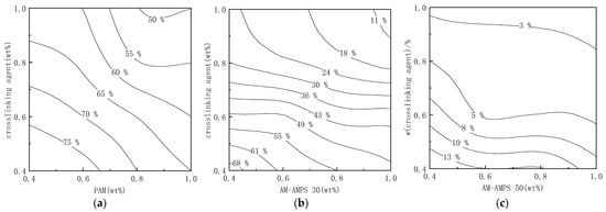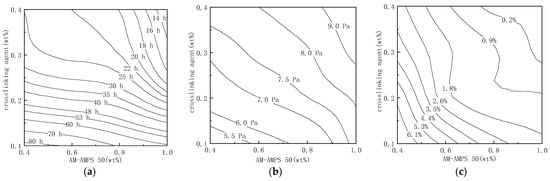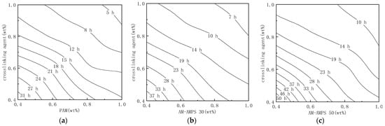 It is evident that the gelation time and the mass fraction of the polymer and crosslinking agent have a negative relationship when the content of AMPS is constant. When the mass fractions of the polymer and crosslinking agent are both 0.4–1.0 wt%, the gelation time with PAM as the main agent is 4–32 h; the gelation time of an AM-AMPS copolymer with AMPS content of 25% as the main agent is 5–40 h; and the gelation time of an AM-AMPS copolymer with AMPS content of 47% as the main agent is 7.5–55 h. That is to say, when the AMPS content increases, the gelation time becomes significantly prolonged, which is similar to the results of Xu et al. [,].