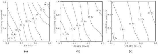 As seen in Figure 2, the storage moduli of the gels prepared by crosslinking polymers with different AMPS content and the modified water-soluble phenolic resin at 105 °C after 5 days were measured. It can be seen that the strength has a good positive association with the mass fraction of the polymer and crosslinking agent. When the mass fractions of the polymer and crosslinking agent are both 0.4–1.0 wt%, the strength of AM-AMPS gels composed of AMPS monomer content of 0%, 25% and 47%, respectively, is 14–40 Pa, 10–30 Pa, and 5–18 Pa. That is to say, as the AMPS content in the polymer increases, the gel strength weakens, which is similar to the research results of Wang et al. [].