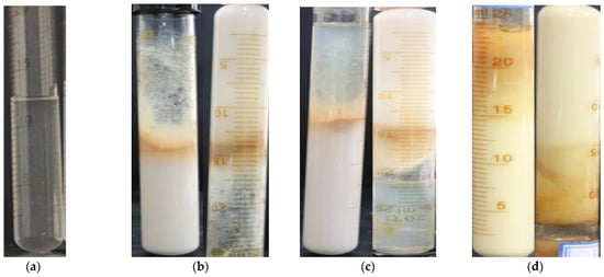 State changes of the modified water-soluble phenolic resin gel after adding Tahe water: (a) the state of the gel for 0 h; (b) the state of the gel for 24 h; (c) the state of the gel for 7 days; (d) the state of the gel for 30 days.
