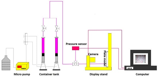 The performance of the most stable water-soluble phenolic resin gel (1.0 wt% AM-AMPS 50 + 1.0 wt% modified water-soluble phenolic resin + 0.4 wt% thiourea) was evaluated by conducting a displacement experiment in a self-made visual glass flat plate model filled with sand. The experimental process, which is shown in Figure 6, can be divided into three steps: first, after the model is saturated with oil, primary water flooding is carried out until the water cut reaches 94%; then, 0.3 PV of the modified water-soluble phenolic resin gelant is injected and allowed to sit for 24 h; finally, the subsequent water drive is conducted until the water cut reaches 98%.