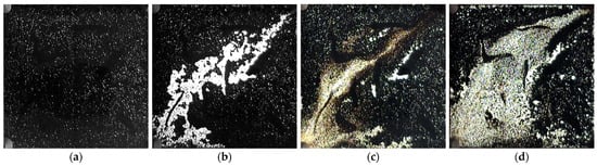 The distributions of residual oil at different stages were observed using a heterogeneous visual sand-filling model, as shown in Figure 7. From Figure 7b, it can be seen that during water injection development under heterogeneous reservoir conditions, water gives priority to flow in the high permeability zones to form fluid channeling, and the color becomes significantly lighter because of the decrease in oil content after the primary water drive. The analysis of Figure 7d reveals that the gelling agent successfully forms a robust gel in the central region of the reservoir, thereby inducing a plugging effect. The gel formation obstructs the “dominant channel” in the high permeability zones, leading to the displacement of oil by water in the low-permeability section. Consequently, the oil sand in the low permeability zones exhibits a lighter color, indicating an enhancement in the sweep efficiency and an improvement in the recovery of crude oil due to the injection of gel.
