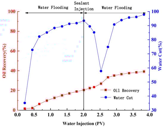 Figure 8 illustrates the correlations of oil recovery and water cut with injected volume of water in the experiment. The results indicate that an increase in water injection leads to a gradual rise in oil recovery. At water cut of 93.48%, the cumulative oil production amounted to 16.3 mL, resulting in a recovery rate of 20.45%. After the gel is injected, it occupies the pores in the highly permeable zone of the model. Subsequently, during the secondary water flooding phase, water infiltrates the low permeability layer, displacing some of the oil before creating a new water flooding path. The displacement of oil by water flooding results in a gradual improvement in recovery. After water cut of 97.84% is reached, the cumulative oil production amounts to 31.22 mL, and the recovery rate reaches 39.17%. The introduction of gel during secondary water flooding leads to an increase in oil recovery by 18.72%.