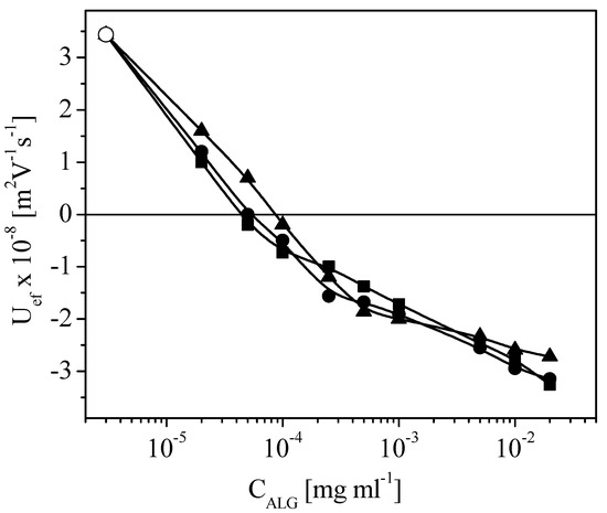 The isoelectric point (IEP) of the particles with an adsorbed polymer is achieved in the range of ca. 3 × 10−5 to 10−4 mg/mL of alginate. The re-stabilization of the system is achieved at a higher concentration of polymer (ca. 10−2 mg/mL). However, despite the registered slight difference in the IEP of the particles in the presence of different alginate samples, there was no significant correlation between the particles’ electrokinetic behavior and the polymer’s characteristics.