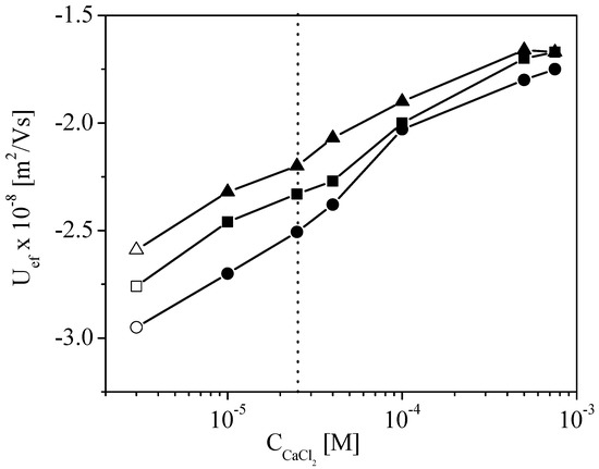 Electrophoretic mobility, Uef, of particles with adsorbed alginate layer in the presence of CaCl2: A082 (▲), A122 (■), and A047 (●). Open symbols correspond to the particles with adsorbed alginate layer without addition of CaCl2. The concentration of alginate in suspension is 10−2 mg/mL. The vertical dot line indicates the interval of CaCl2 concentrations with almost constant ionic strength of the suspensions.