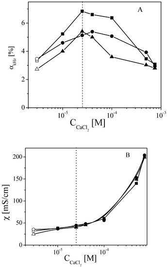 Dependence of the registered electro-optical effect, αkHz, (A) and electrical conductivity, χ, (B) from a suspension of particles with adsorbed alginate layer in the presence of CaCl2: A082 (▲), A122 (■), and A047 (●). Open symbols correspond to the particles with adsorbed alginate layer without salt. The concentration of alginate in suspension is 10−2 mg/mL. The vertical dot line indicates the interval of CaCl2 concentrations where the ionic strength of the suspensions is almost constant. The frequency of the electric field is 1 kHz. The electric field strength is 2.3 × 104 V/m.