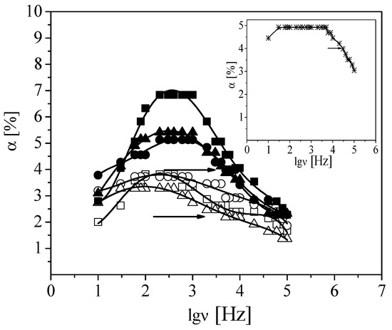 Frequency dependence of the electro-optical effect, α, from a stabilized suspension of particles with adsorbed alginate layer in the presence of 2.5 × 10−5 M CaCl2: A082 (▲), A122 (■), and A047 (●). Open symbols correspond to the particles with adsorbed alginate layer without salt. The concentration of alginate in suspension is 10−2 mg/mL. The electric field strength is 2.3 × 104 V/m. Inset: Frequency dependence of suspension of bare particles.
