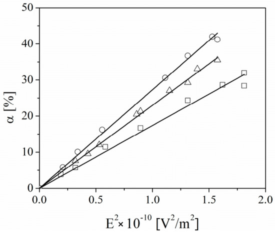Electro-optical effect from suspensions of particles stabilized by adsorbed alginate molecules: A082 (△), A122 (□), and A047 (○). The concentration of alginate in suspension is 10−2 mg/mL. The frequency of the electric field is 3 kHz.