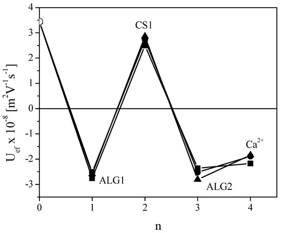 Another possibility for a comparative investigation of the electrokinetic properties of a suspension of particles stabilized with alginates with different Mw and M/R ratios is based on their ability for specific interaction with Ca2+ ions. Figure 2 presented the electrokinetic response from stabilized suspensions (alginate concentration is 10−2 mg/mL) in addition to CaCl2. The dependencies indicate that the decreasing Uef of the particles are a function of the Ca2+ concentration. According to the presented results, the decrease in the Uef is pronounced for alginates with lower M/R ratios (if the polymers have very close Mw, samples A082 and A122) or higher Mw (if the polymer M/R ratios are relative, samples A082 and A047).