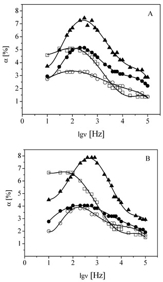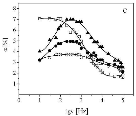 The dependencies from the particles with adsorbed chitosan layers are presented in Figure 8. These indicate there is a plateau at a lower frequency of the electric field (below 1 kHz). The experimental value of νcr, exp is ca. 4 kHz and does not depend on the alginate sample. In correspondence with our previous studies, it can be supposed that the electro-optical behavior of the particles covered by a chitosan layer is defined by the polarization of condensed counterions along the polyion chain deposited in the last adsorbed step [28].