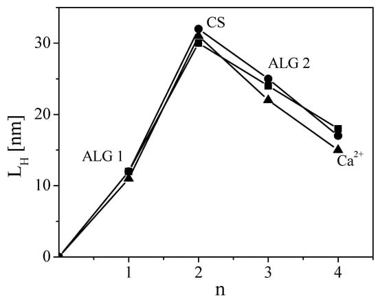 Dependence of the hydrodynamic thickness of particles with chitosan/alginate film formed from ALG-A (▲), ALG-B (■), and ALG-C (●) as a function of the adsorbed steps.