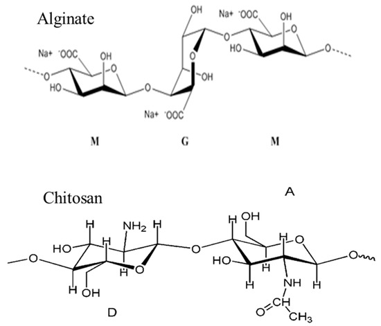 Schematic chemical structure of alginate sodium salt (guluronate, G, and mannuronate, M, residues) and chitosan (acetylated, A, and deacetylated, D, monomers).