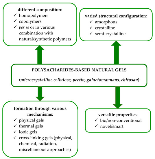In the last few years, an attractive approach based on combinations of different polysaccharides with each other or with other polymers (natural and/or synthetic) has emerged in the research area of polysaccharide-based gels. A schematic representation of some important issues related to these gels is given in Figure 1.