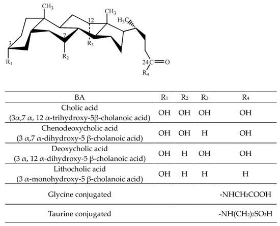 The synthesis of BA takes place in liver cells (hepatocytes). The resulting acids are primary (cholic and chenodeoxycholic acids) that have been synthesized from cholesterol conversion catalyzed by hepatic microsomal cholesterol 7α-hydroxylase. In the liver cells, the conjugation of primary BA with glycine (75%) and taurine (25%) takes place, leading to conjugated BA. The conjugated acids are stored in the gallbladder. When the digestion process begins, they are released from the gallbladder through the bile duct into the small intestine. Here, due to intestinal pH value (7–9), BAs are in the protonated form, which increases their solubility and fat emulsification capacity. Secondary BAs (deoxycholic acid and lithocholic acid) are obtained by 7α-dehydroxylation of the conjugated BA in the intestinal lumen followed by splitting of glycine and taurine groups. Cholic acid is transformed into deoxycholic acid, while chenodeoxycholic acid is converted into lithocholic acid. BAs are reabsorbed through the intestinal epithelium of the terminal ileum and reach the liver through the portal vein. This circuit of BAs in the body constitutes the enterohepatic circulation and has the role of maintaining a constant level of BAs in the body. Overall, 95% of the production of BAs ends up being reused through the enterohepatic circuit, the remaining 5% being lost through excretion. The loss of BAs is compensated by their de novo synthesis in the hepatocytes.