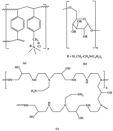 Chemical structures of cholestyramine (a), colextran (b) and colestipol (c).