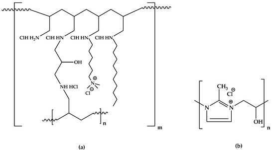 Because it contains secondary and tertiary amino groups in the chemical structure, its efficiency depends on the pH of the environment. Thus, at the pH of the small intestine (7–9), all amino groups are ionized. The above commercial resins preferentially bind dihydroxy BA from the gastrointestinal tract (GIT). Since the liver produces both dihydroxy and trihydroxy BA, the content of trihydroxy acids in the BA pool increases over time by using BASs, causing a decrease in BAS efficiency. Moreover, the stability of the BAS–BA complex is poor, leading to partial BA dissociation along the GIT, due to pH variation and presence of competitive anions. Consequently, high doses of first-generation BASs (16–24 g/day) are necessary to obtain a significant therapeutic response (20% cholesterol reduction), and hence the need to synthesize new compounds with increased binding capacity and affinity to bile salts. The drawbacks of first-generation BASs led to extensive research focused on the design of new more efficient cationic gels. From these gels, only colesevelam hydrochloride and colestilan (or cholestimide) (Figure 4) have been approved for marketing: colesevelam in the US under the trade name WelChol and colestilan in Japan with the trade name Cholebine [71,72,73,74,75,76]. These second-generation BASs have an increased affinity to bile salts and fewer adverse effects than first-generation BASs. Colesevelam (Figure 4a), having in its chemical structure both primary amino groups and quaternary ammonium salts, allows the binding of BA salts through electrostatic and hydrophobic interactions. Due to its chemical structure, colesevelam has affinity for both di- and trihydroxy BA, being three times more effective than cholestyramine and colestipol. Irritation of GIT and constipation are among the side effects of colesevelam. Colestilan (Figure 4b) contains imidazolium salts [77]. It is obtained by cross-linking of poly(2-methylimidazole) with epichlorohydrin. In vitro studies demonstrated for colestilan a superior capacity of binding BA salts compared to cholestyramine, due to its higher ion exchange capacity and water retention.