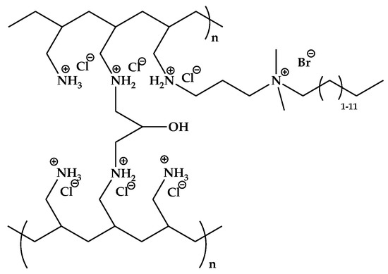 Several amphiphilic cationic hydrogels were prepared by the cross-linking of soluble poly(allylamine) with epichlorohydrin, followed by the alkylation of the resulted gel with different 3-chloropropyl)dimethyl-alkylammonium bromides (where alkyl was C4–C12) (Figure 11) [98]. The factors (degree of cross-linking, length of alkyl substituent) that can influence the equilibrium swelling behavior of the gels were studied using alcohols with different lipophilicity as solvents. Polymeric swelling capacity decreased as cross-linking density increased, which showed that the stiffness of cross-linked matrix governs the swelling process. Swelling ability of the polymers reached the maximum value for C4, decreased moderately between C4 and C6, and dropped significantly after C8 chain due to the collapsed structure of the gel as a result of the cooperative hydrophobic self-association of the alkyl chains. Solvent (alcohol) hydrophobicity influenced the swelling process. Thus, polymeric swelling ability was augmented with the increase in solvent lipophilicity. Amphiphilic hydrogels were assessed for their bile salt sequestration capacity by in vivo studies in a hamster animal model. The polymers’ ability to retain bile salts increased with the augmentation of chain lengths from C8 to C12 and dropped for C14 alkyl chain length. This behavior proved that ionic interactions together with the hydrophobic ones played significant roles in bile salts sequestration by these amphiphilic polyammonium hydrogels.