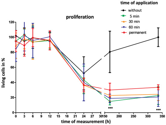 Regarding an application time of 5 min, the cell number decreased significantly after 7 and 14 days (p < 0.001). In terms of absolute numbers, the living cells decreased from initially 94.8 ± 14.0% to 14.8 ± 4.6% after 7 days and to 22.7 ± 11.8% after 14 days.