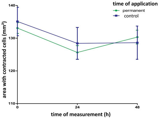 The contraction of the cell matrices after photo processing (High 65,535, Low 51,765, Gamma 1.18) is shown for gelatin-based hemostat application at different time points (0, 24 and 48 h after application). There was no significant difference between the control (blue curve) and application group (green curve) within the 48 h time window. Cell matrix contraction remained unchanged after gelatin-based hemostat application (one-way ANOVA with Bonferroni correction, n = 12 per group). Control: Group of fibroblasts where no hemostat was applied.