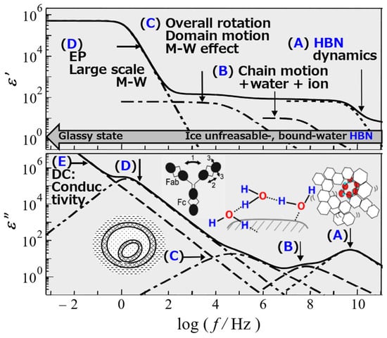 Relaxation processes reflect typical molecular mechanisms in aqueous systems. (A) 10 GHz process: dynamics of HBN: hydrogen bonding network (B) Dynamics of polymer chain + interacting water molecules + ion (C) Overall rotation, Domain motion, Maxwell–Wagner (M-W) effect (D) Large-scale M-W, EP: Electrode Polarization (E) DC conductivity.