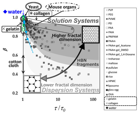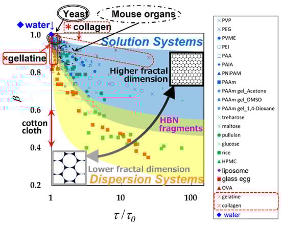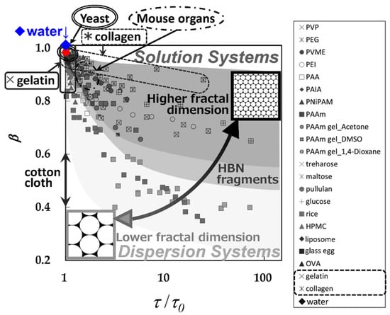 The τ−β diagram makes it evident that plots and trajectories derived from the dependence of the water content are localized in each region for solution or dispersion systems. At the outset of the analytical procedure, it was noted that quite small values around 0.1 and the significant errors around 100% of the fractal dimension obtained for dispersion systems like protein/water mixtures were issues. A fractal dimension adjustment parameter was set to 2 in real applications of Equation (A1), following a two-dimensional hydrogen bond network. The fractal dimension at 0.1 remains modest even if the correction parameter is fixed again.
