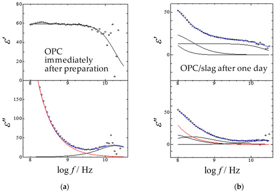 The curve-fitting results and frequency dependence of complex permittivity for aqueous mixtures with the W/C ratio of 60% for (a) OPC paste obtained immediately after the preparation and for (b) OPC/slag paste as 30 wt% slags obtained after one day. Blue lines are the sum of each process, and red lines are dc contributions. The solid lines were obtained from the fitting procedures.