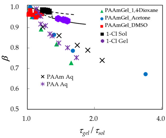 Since it is difficult to distinguish between the scaling behavior of solvent molecules confined in the gel network and the normal concentration-dependent slow dynamic behavior of solvent molecules, except in regions of strong contraction, we used the τ–β diagram shown in Figure 8 reproduced from our previous report [37,38] for the fractal analysis. For comparison, the results of PAAm and an aqueous solution of PAA considering the possibility of hydrolysis are also shown in Figure 8. Though the volume range is dependent on the solvent, in the case of the gel, the trajectory of the plot shifts toward the lower left in the figure compared to the aqueous system, indicating that the HBN is broken and has a low fractal dimension water structure. The plot of the most contracted gel obtained in an aqueous acetone solution cannot be realized with the aqueous system due to the precipitation. The position of the plot is shifted in the water-rich direction on the right side of the screen.