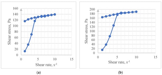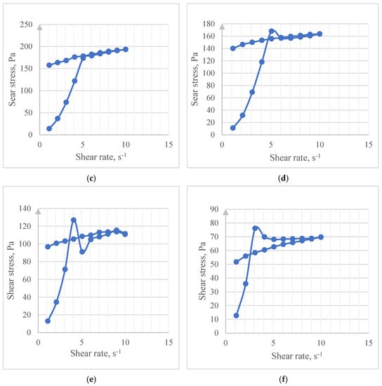 | Composition of the Analyzed Sample n = 3 | Average Dynamic Viscosity (100 s−1) at a Temperature of 32 °C | Standard Deviation | Sample Variance | Ranges of Average Values of the Shear Stress in the Large Shift–Small Shift Mode (from 10 to 0 s−1) |