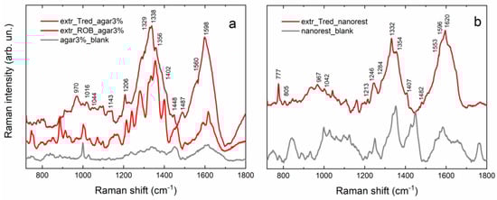 - Platania, E.; Lombardi, J.R.; Leona, M.; Shibayama, N.; Lofrumento, C.; Ricci, M.; Becucci, M.; Castellucci, E. Suitability of Ag-Agar Gel for the Micro-Extraction of Organic Dyes on Different Substrates: The Case Study of Wool, Silk, Printed Cotton and a Panel Painting Mock-up: Suitability of Ag-Agar Gel. J. Raman Spectrosc. 2014, 45, 1133–1139. [Google Scholar] [CrossRef]