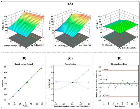 Image illustrating the impact of independent factors on the %EE-TAC: (A) 3D surface plot; (B) predicted vs. actual response; (C) perturbation plot; and (D) residual vs. run plot of TAC-THQ-NLCs optimized by BBD.