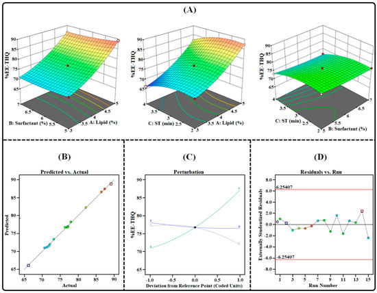 Image illustrating the impact of independent factors on the %EE-THQ: (A) three-dimensional surface plot; (B) predicted vs. actual response; (C) perturbation plot; and (D) residual vs. run plot of TAC-THQ-NLCs optimized by BBD.