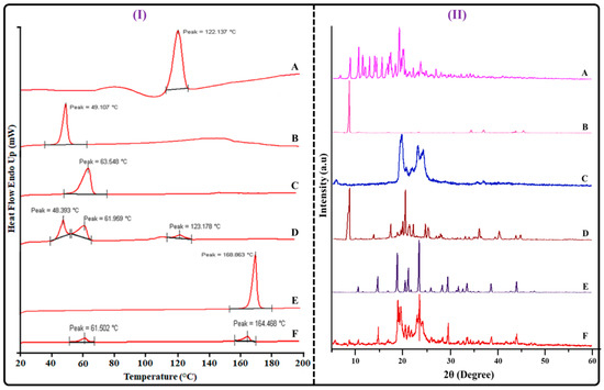 Image showing (I) DSC curves (II) Powder-XRD of (A) TAC; (B) THQ; (C) GMS (D) physical mixture (TAC, THQ, GMS); (E) mannitol; and (F) lyophilized TAC-THQ-NLCs.